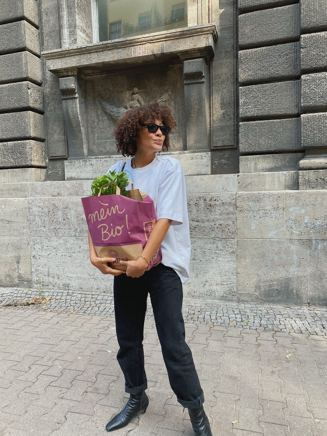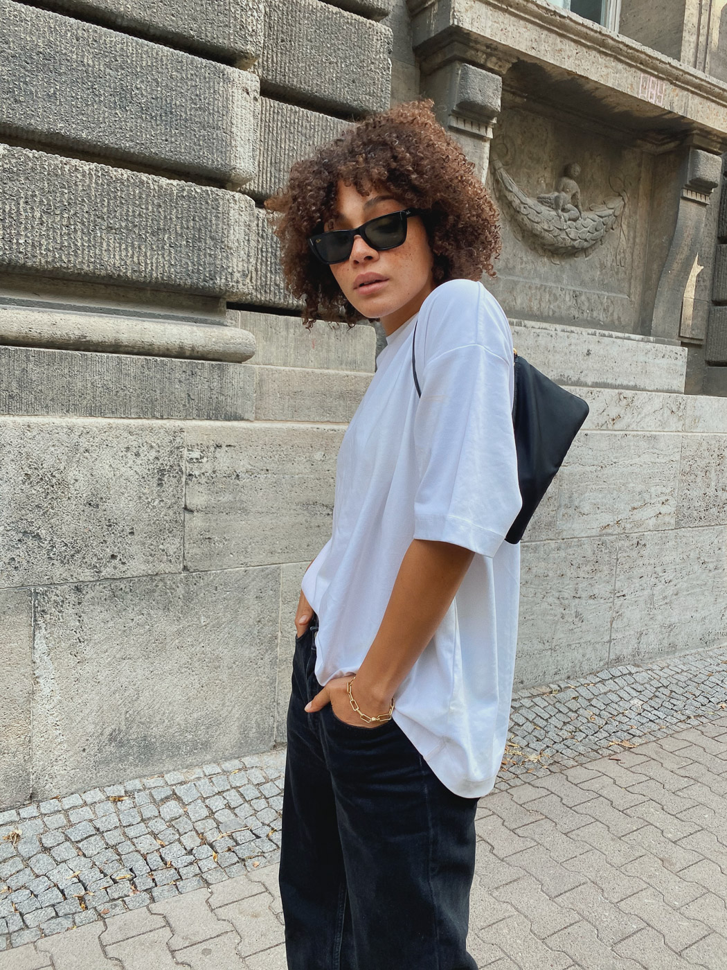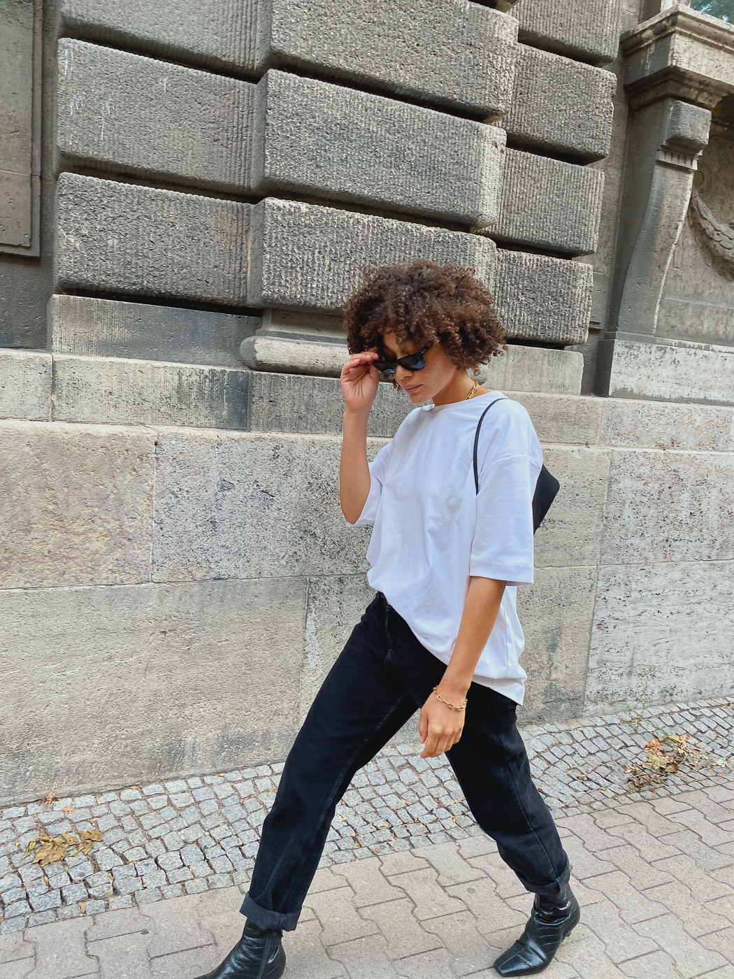 This article contains affiliate links. You guys, time for an easy look as we are letting the Berlin summer drift away. The warm temperatures, sitting outside, the spontaneity with which we moved around despite Covid 19. With all the confusion and uncertainties at the moment I like to throw on simple looks, just an easy white T-shirt, jeans and some boots. The jeans and the Prada bag are vintage finds, boots and T-shirt are both from ARKET. You might have noticed that these ARKET T-Shirts have really grown on me. The quality and oversized fit is exactly the level of effortlessness I need at the moment.
