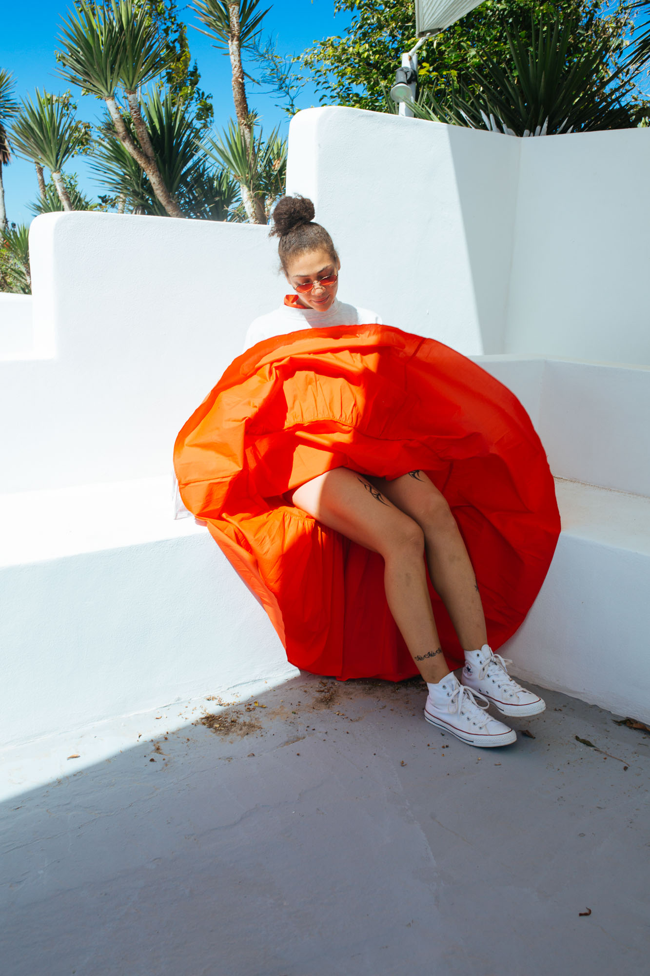 With color you can get started in the summer, so on my last day, I went for a bright salmon dress from Twinset, a clear Coccinelle bag, a vintage pullover, and classic white chucks. I am a fan of warm bright colors and love me some bright blue tones too. Â