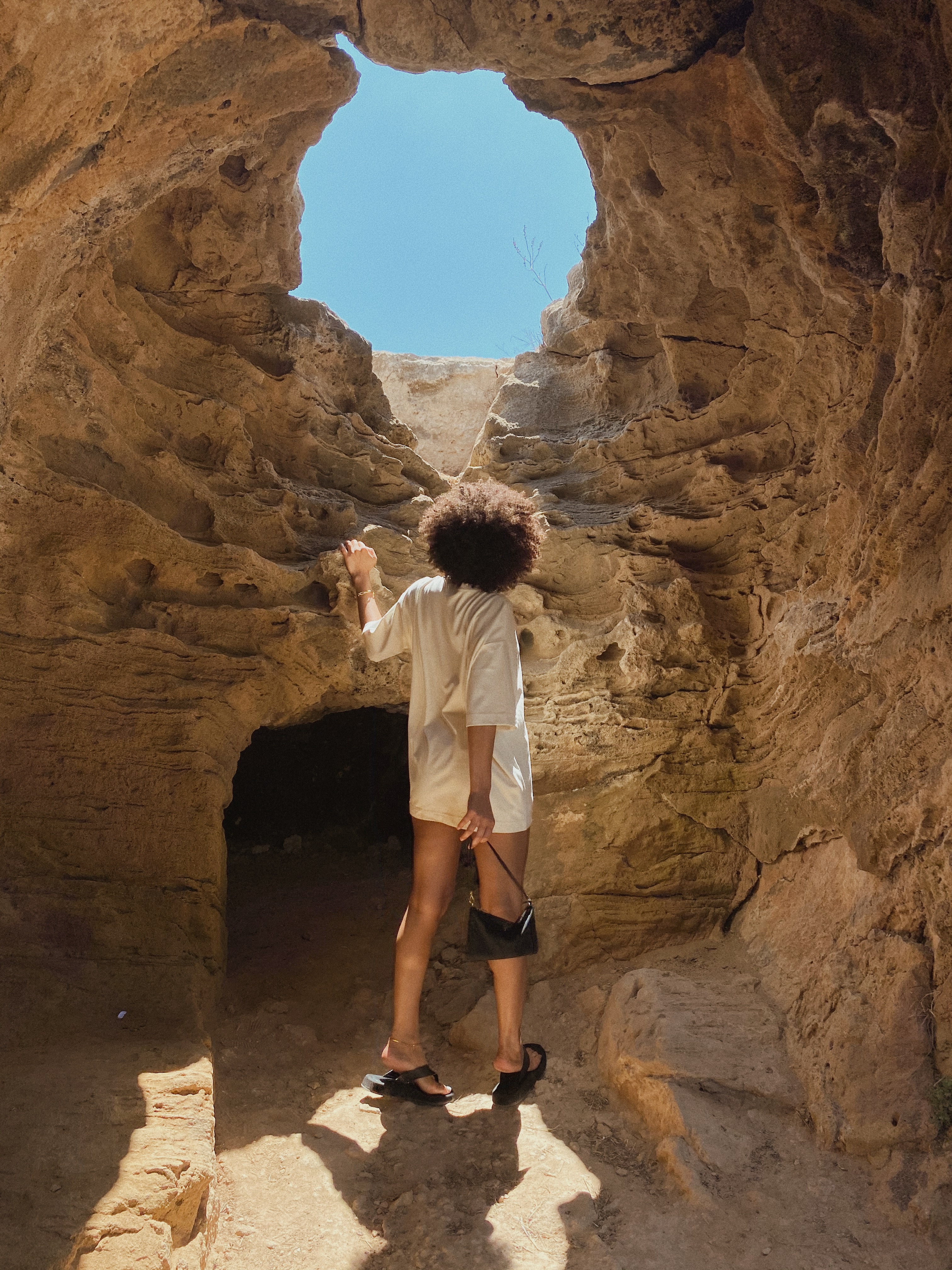 Cyprus enjoys more than 340 days of sunshine a year, the stunning Mediterranean island overflows with rocky coves and pools, golden sands and beautiful natural pebble beaches. You’ll be enveloped by the scent of flowers and the beautiful bougainvillea that grows here abundantly. The Island is a haven for any (nature) lovers and it is particularly fitting that it is also the birthplace of Aphrodite, the ancient goddess of love and beauty. Steeped in legend, myth, beauty and romance there are many opportunities to dive into the ancient stories and wander between Greek temples and Castles, like the ones in Paphos or Kouklia. I am more a nature lover than a fan of excursions but exploring Cyprus checkered past, a mix of different civilizations and cultures was very exciting. On one of our first days we visited the Tombs of the Kings, an important archaeological site in Cyprus with a breathtaking sea view, which has been on the UNESCO World Heritage List since 1980. The monumental underground tombs are carved out of the rock and date back to Hellenistic (323 v. Chr. – 30 v. Chr.) and Roman times (27 v. Chr. – 284 n. Chr.). Instead of kings, high-ranking officials and aristocrats were actually buried here, but the size and magnificence of the tombs – some of them decorated with doric columns – gave the site its grand name. Some of the tombs imitate the houses of the living, with the burial chambers opening out into a peristyle-like atrium.