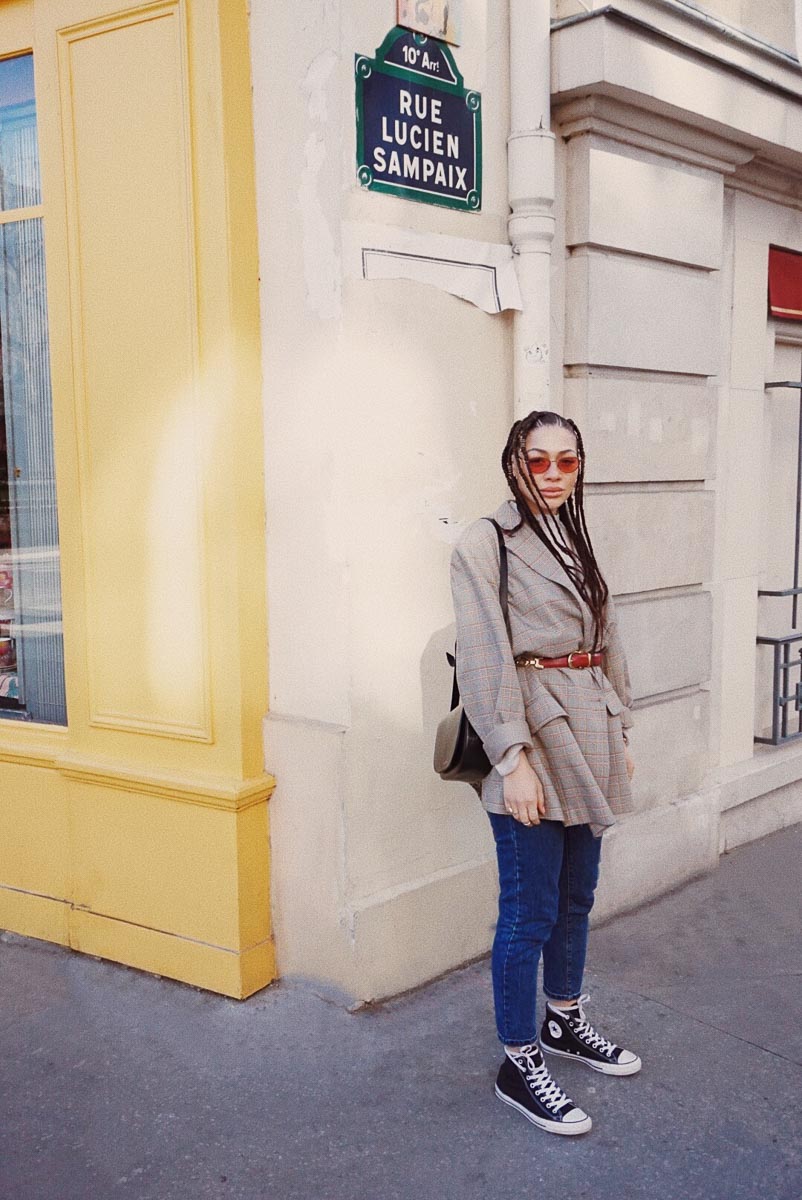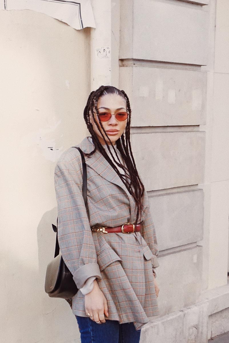 Paris with two of the best human beings my brother Ruben and my Ben. No business, we just chillaxed for the weekend. I packed a trolly with some of my treasured vintage pieces: my red patent leather boots and my checkered blazer from Antiquariat Weigelt, one of my favorite vintage stores in Berlin. Especially now that my hair is braided by amazing Adiam (check her out if you are looking for someone to bless your hair in Berlin) the icy wind was cold, but the sun made up for it. So most of the time I wrapped a vintage silk scarf around my head paired with my Vogue x Gigi Hadid micro shades. By the way, tiny shades are on trend in 2018. Looking for some? You can find my favorite selection of sunglasses here.